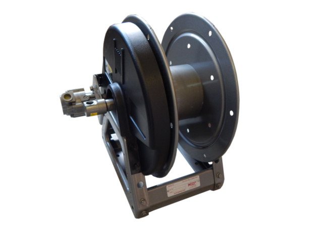 Power rewind reels include: chain and sprocket drive powered by hydraulic motor.