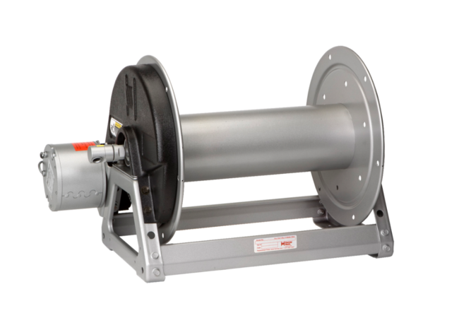 Power rewind reels include: chain and sprocket drive powered by electric motor.